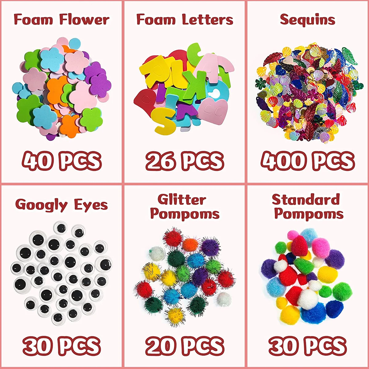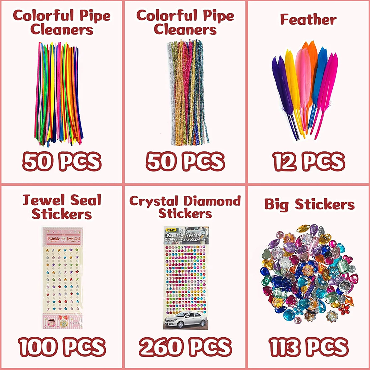 5* Craft Papers 50* Wooden Sticks 30* Wooden Clamp 1* 4.8 m Line 1* Safety Scissors 1* Doubie-sided Stickers 40* Foam Flower 26* Foam Letters 400* Sequins 30* Googly Eyes 20* GiLLer Pompoms 30* Standard Pompoms 50* Ribbon 50* Color flash band 12* Feather 100* Jewei Seal Stickers 260* Crystal Diamond Stickers 113* Big Stickers