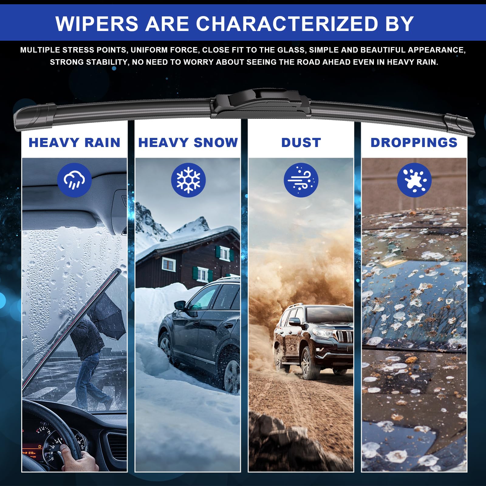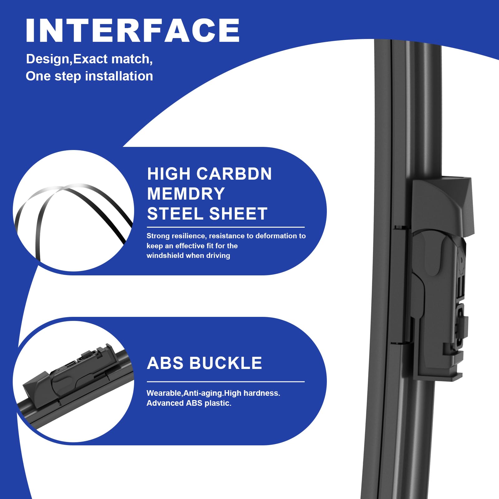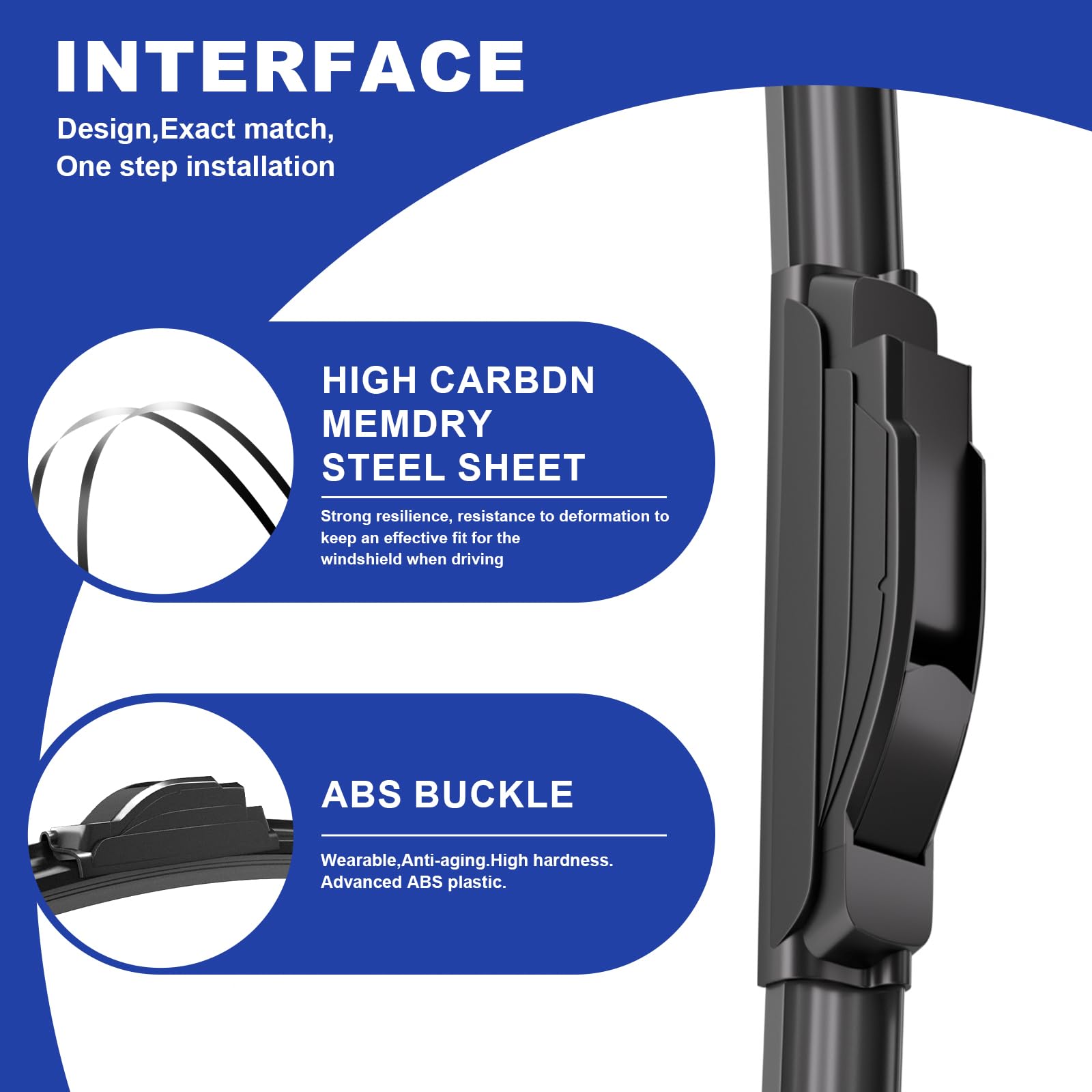 - 0 stripe wiping: Double high toughness memory spring steel plate, combined with asymmetric wind deflector, provides uniform pressure distribution and better windshield contact, leaving no gaps during wiper operation.