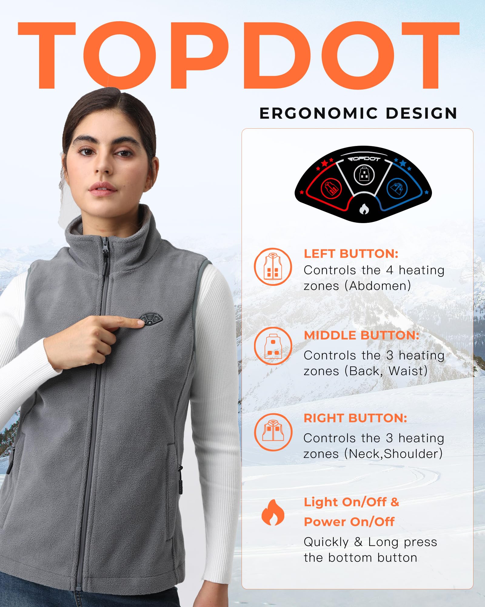 - [4-in-1 Smart Controller & Independent Control] The Topdot heated vest for women is easily operate the vest's 3 heating zones with a dedicated 4-button controller for personalized warmth. The upgraded design includes a light-off function, allowing you to disable lights during use to avoid embarrassment discreetly
