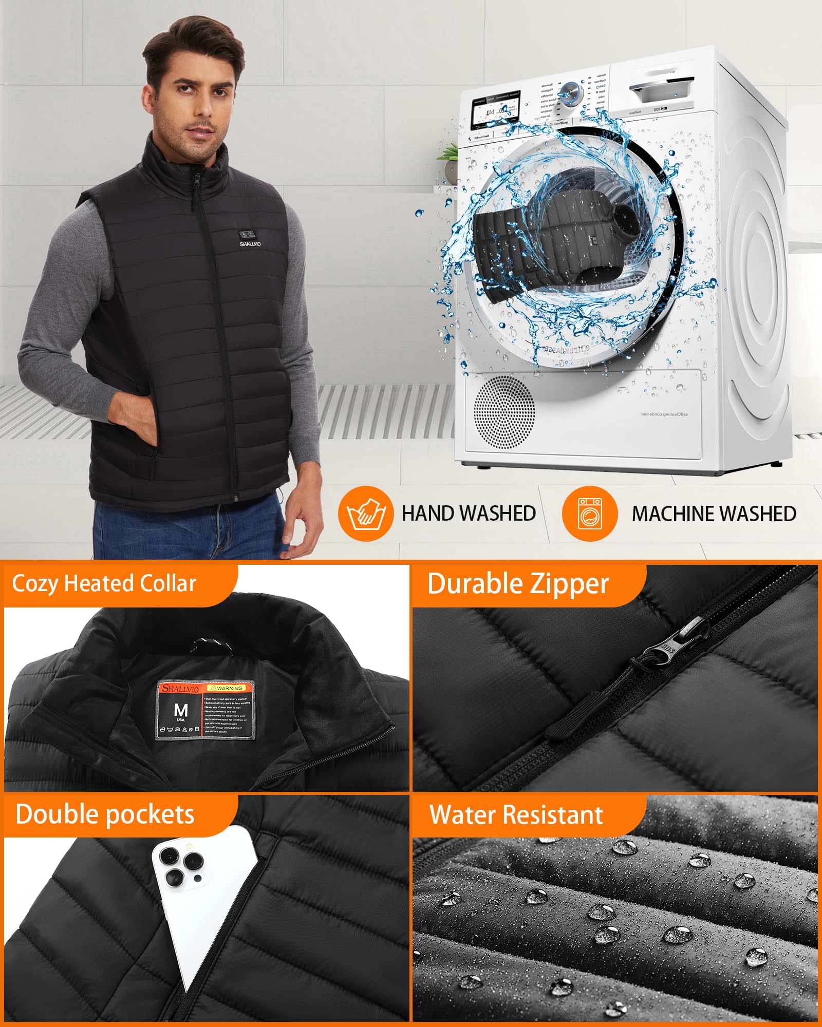 - Classic Design and Durability: Our water-resistant, lightweight heated vest for men features a plush-lined full collar, offering exceptional warmth and protection. The classic quilted pattern, fitted seams, zippered pockets, and stand-up collar ensure both style and functionality. Built to last, this heated vest is perfect for layering over sweaters, shirts, or hoodies.