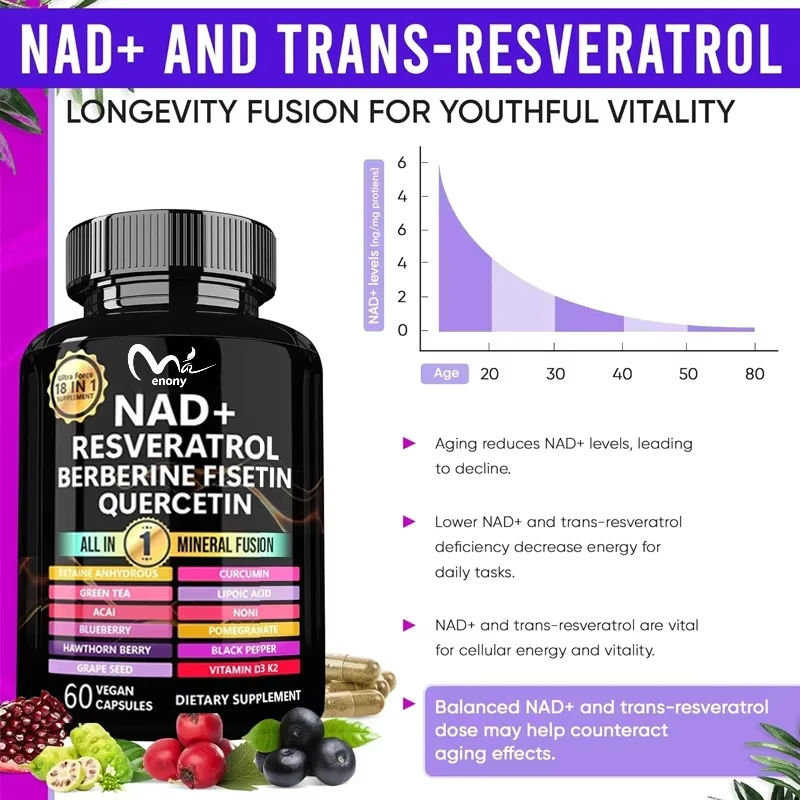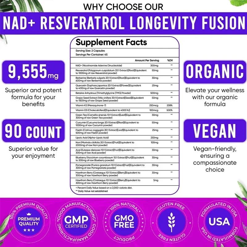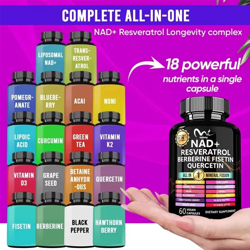 Integrated Superpower NAD+Resveratrol Fusion: Introducing a groundbreaking liposome NAD Resveratrol supplement fusion led by NAD+and Resveratrol, a powerful blend containing a total of 18 active ingredients that support cellular health, cardiovascular function, endurance, and healthy aging. This comprehensive formula includes NAD+, 1000mg pure organic resveratrol, berberine, anhydrous betaine, grape seed extract, vitamin K2, vitamin D3, green tea, curcumin, fisetin, alpha lipoic acid, nori, acai berry, blueberry, pomegranate, hawthorn, and black pepper.