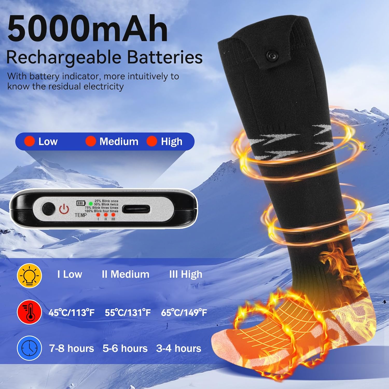 - 3 Heating Levels: Included three adjustable heating levels in our socks. This feature allows you to customize the temperature to your exact preference, enhancing your comfort during use. The three levels range from a comfortable 45°C/113°F, perfect for chilly mornings, to a high heat of 65°C/149°F, ideal for extremely cold weather or night-time adventures