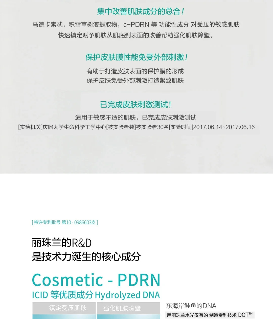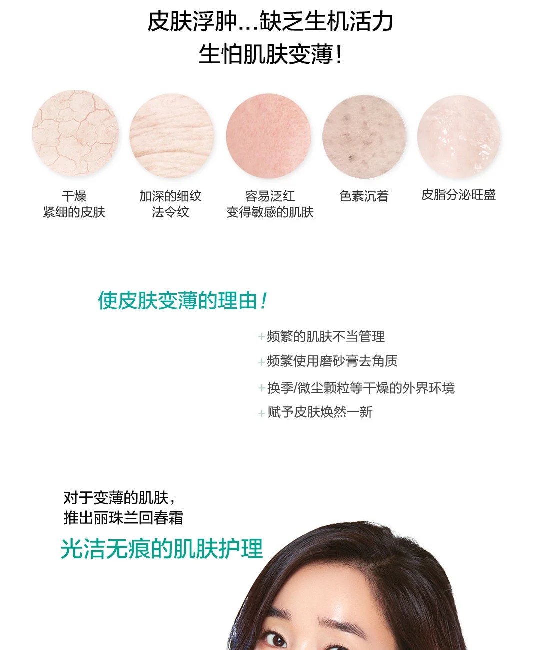 Firming and anti-wrinkle, repairing sensitive skin, improving dullness, calming and soothing , long-lasting moisturizing, soothes irritated skin, relieves dryness, strengthens the skin barrier, strengthens the skin barrier, the unique skin care ingredients help to enhance the skin's own repair function, to create healthy skin. Promote skin improvement grassroots cell regeneration, help to restore healthy young skin due to the external environment caused by damaged skin.
