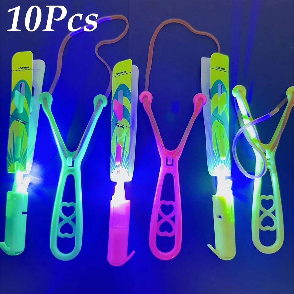 Rocket Slingshot Flying Toys with LED Lights 10Pcs LED Arrow Helicopters + 10Pcs Launchers Flying Toys Luminous Slingshot Toys