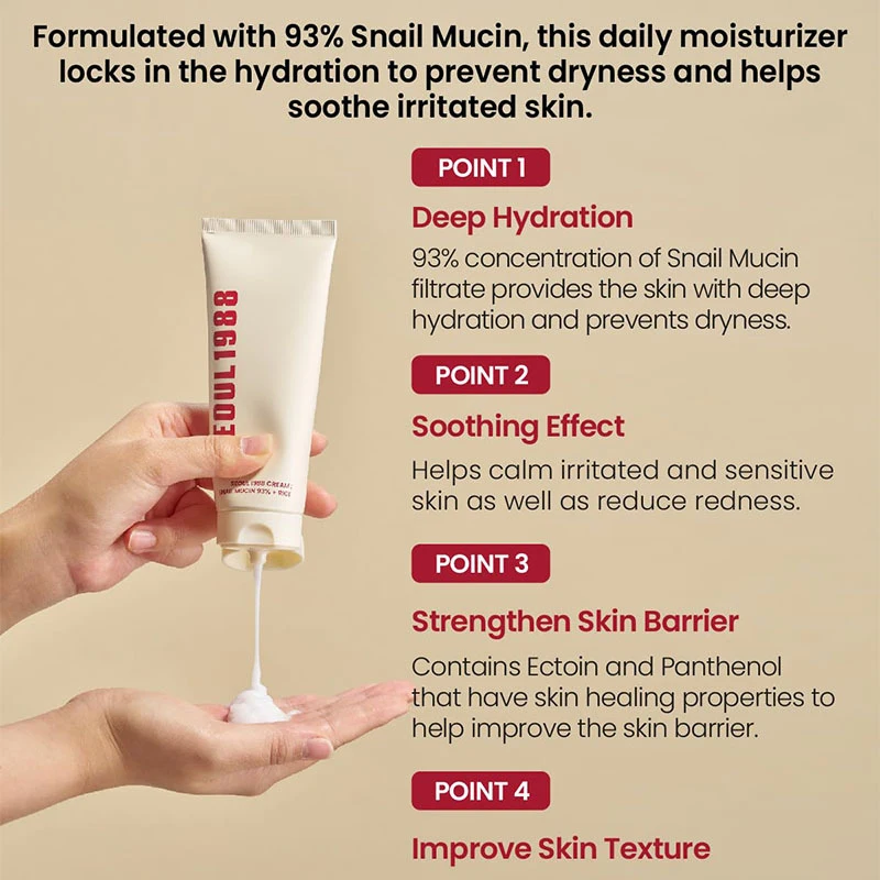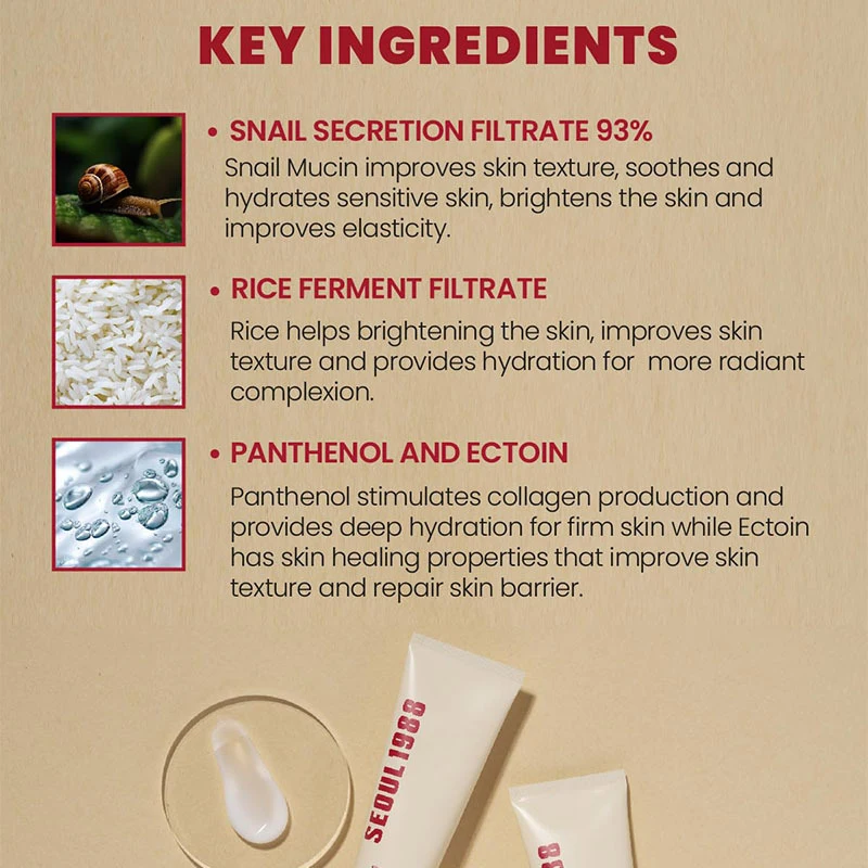 ✔ 100ml Snail Mucin Cream – Deeply moisturizes & strengthens the skin barrier with snail mucin & hyaluronic acid.